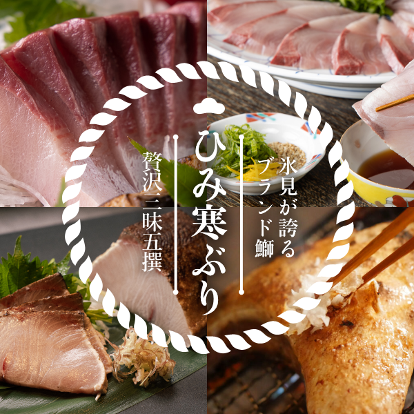 ぶりは、成長にともない呼び名が変わるため出世魚といわれ、氷見では、モジャコ→ツバイソ→→フクラギ→ガンド→ぶりと呼びます。 また、ブランドである「ひみ寒ぶり」とは、富山湾の定置網で漁獲され、魚体や重さが一定の水準を満たした鰤だけが名乗れます。
